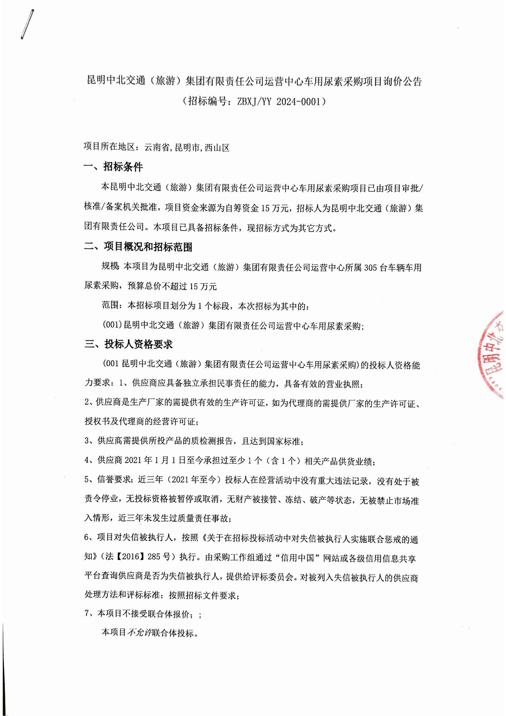 昆明中北交通(旅游)集團有限責任公司運營(yíng)中心車(chē)用尿素采購項目詢(xún)價(jià)公告(招標編號ZBXJYY2024-0001)_01