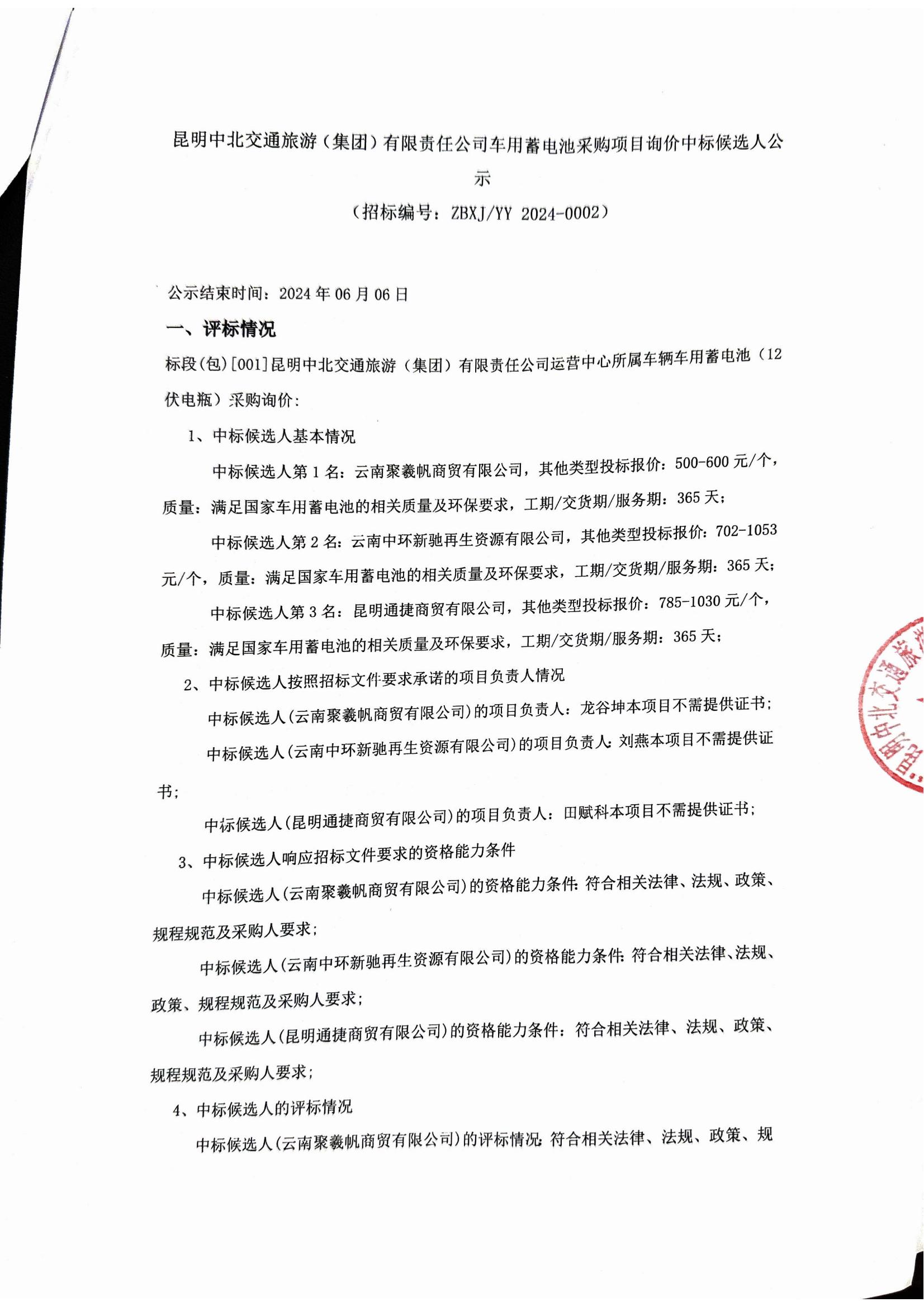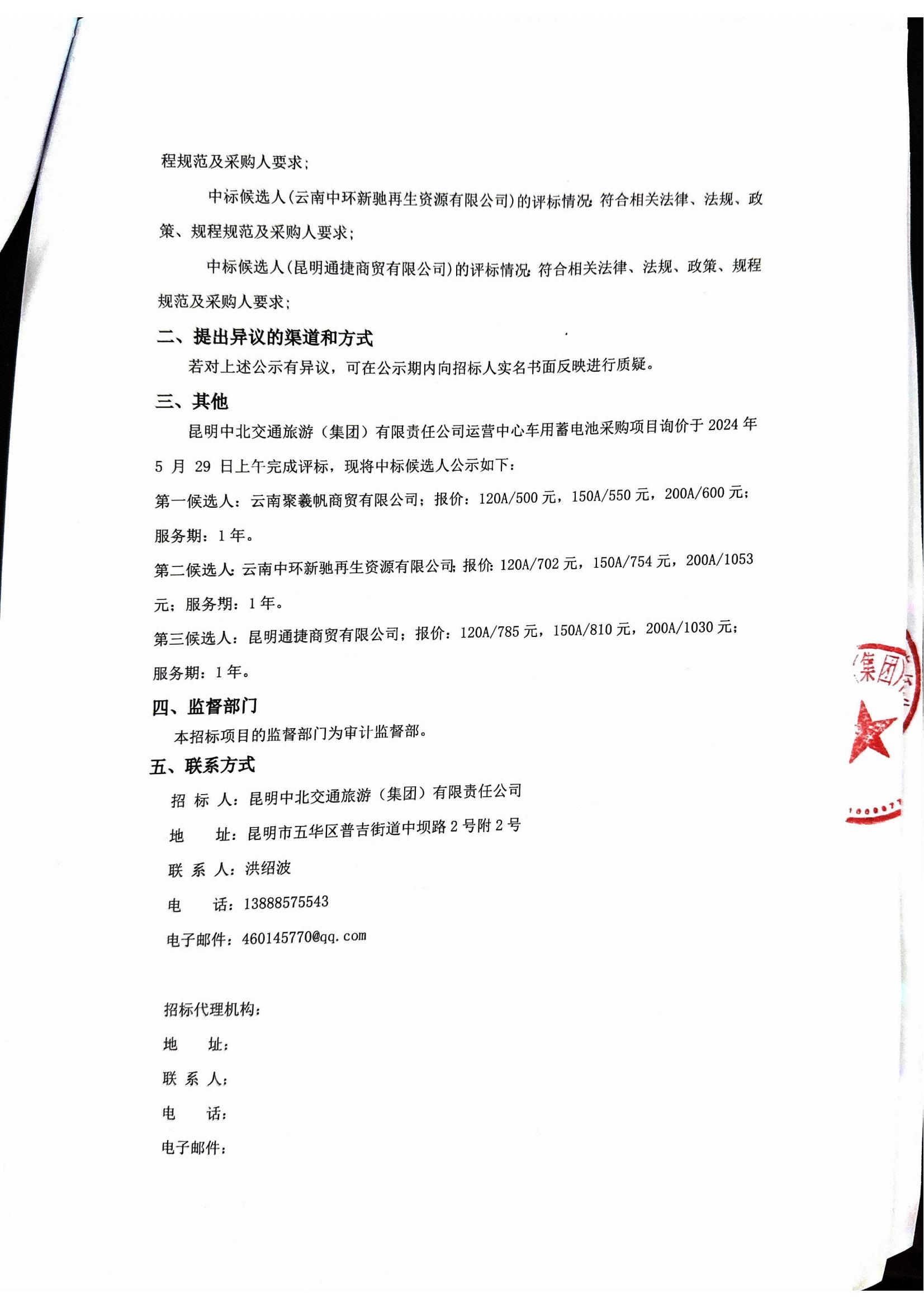 昆明中北交通旅游(集團)有限責任公司車(chē)用蓄電池采購項目詢(xún)價(jià)中標候選人公示